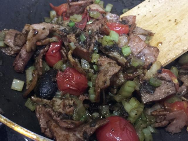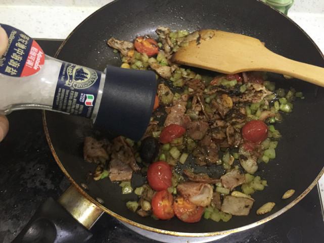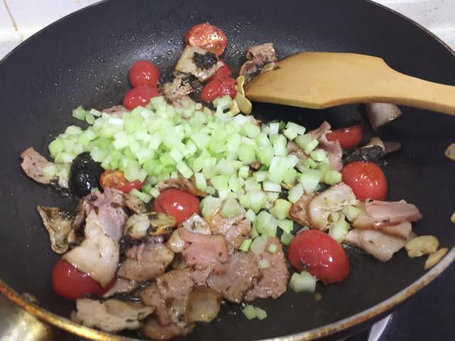 4、放入培根炒出油,入番茄。倒入两大勺橄榄菜,芹菜丁,翻炒。