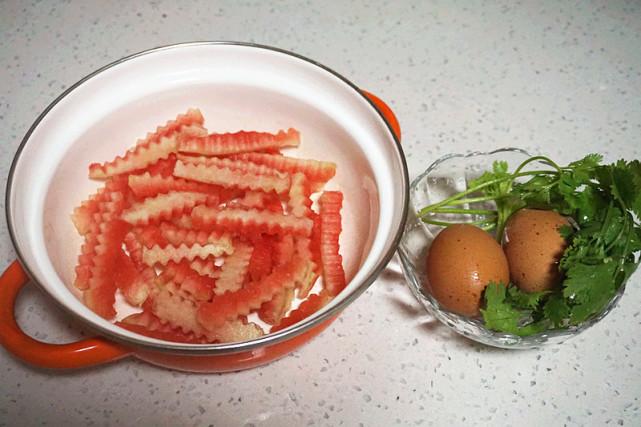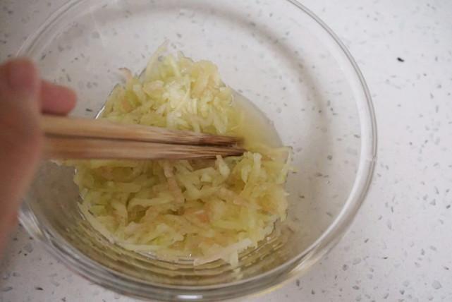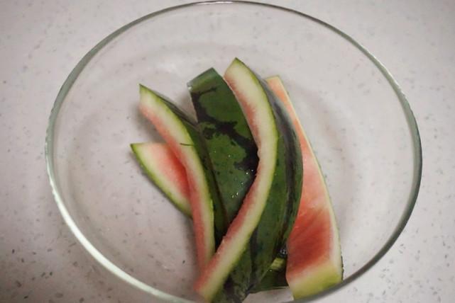 1、吃完的瓜皮,去掉翠绿色外皮。冲洗一下。将瓜皮擦成丝,或切成细条,加一小勺盐,静置5分钟。杀出的水分不要倒,拌面糊用。