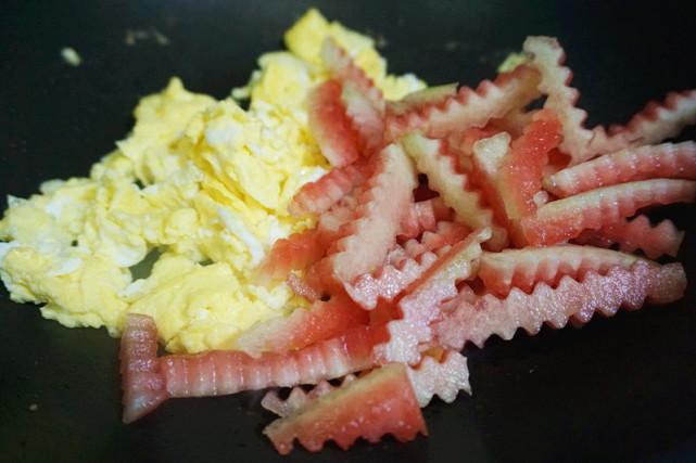 3、蛋液稍微凝固后,倒入瓜皮,快火翻炒,只需要加一小勺盐。