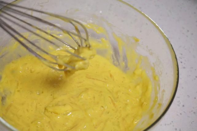 2、两个鸡蛋打散,鸡蛋液倒入擦好的瓜丝中,加入150克的面粉,先搅拌,再分次放入清水。如图这样,略微粘稠即可。在面糊中您可以加入少许五香粉,更好吃。