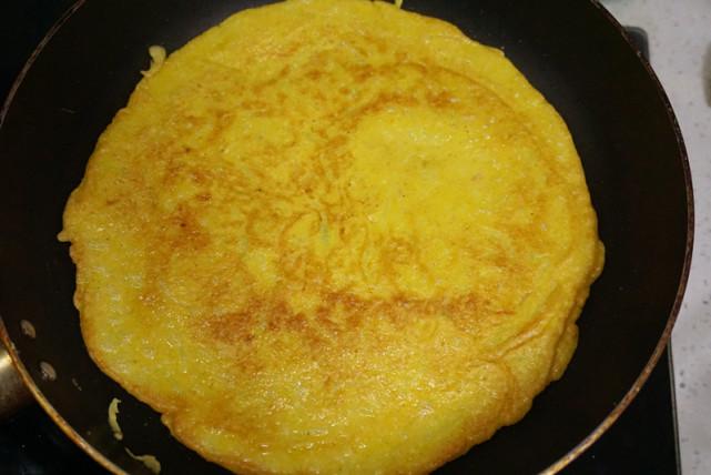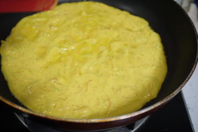 3、平底锅刷一层薄油,先开小火,把面糊平摊在锅底。