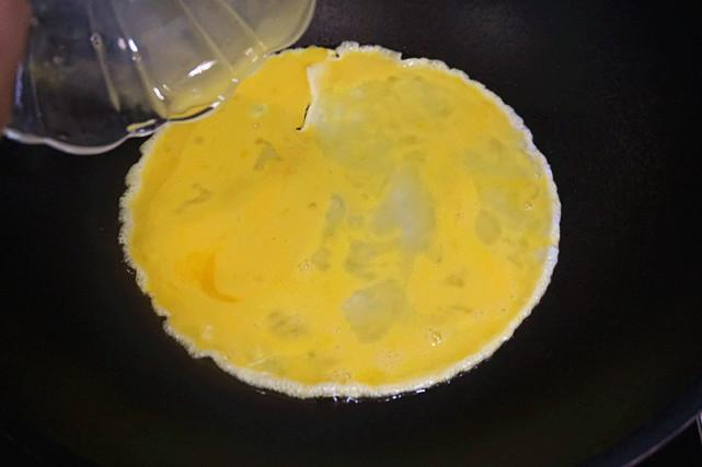 2、坐热油锅,倒入适量食用油,倒入搅拌均匀的蛋液。
