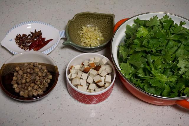 芹菜叶100克;鹰嘴豆1小把;熏干1块