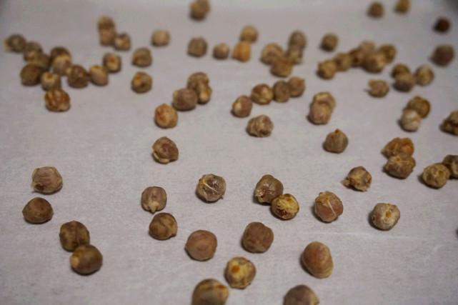 然后铺在烤盘上,入烤箱160度烤20分钟。如此操作,吸饱水分的鹰嘴豆先冷冻再烘烤,使得水分迅速蒸发,这样做出来的口感特别脆香。