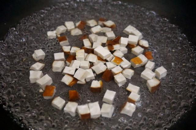 4、做热适量沸水,先焯熏干丁,再放入芹菜叶,捞出后都过凉水拔一下。