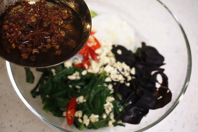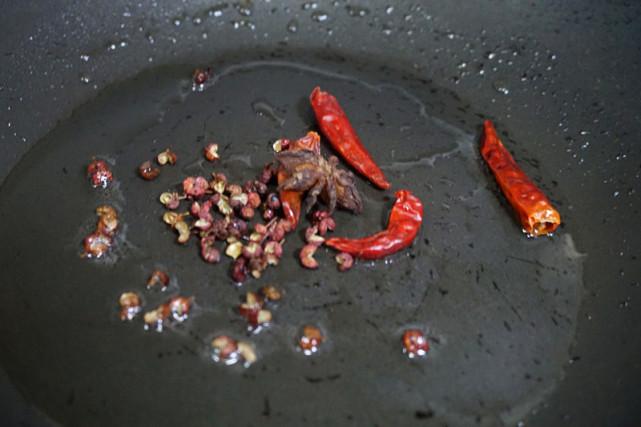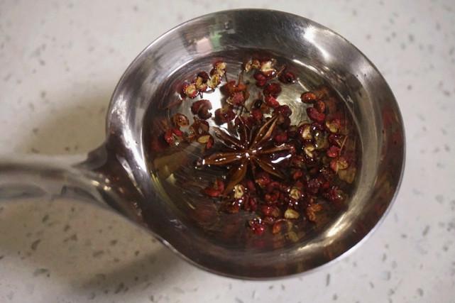 5、三种食材放在一起,现在开始做底油。芹菜叶本来带有略微的苦涩口感,所以用花椒、八角、干辣椒炒出适量底油,热辣辣的浇在食材上,香辣麻的味道瞬间飘出。