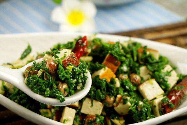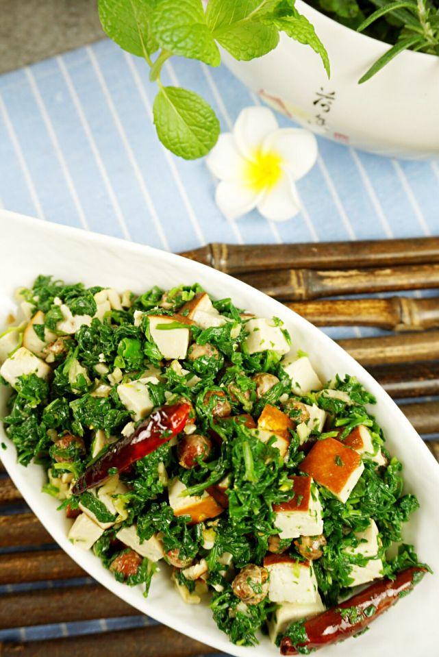 这两种食材搭配做出的芹菜叶鹰嘴豆凉拌熏干,香脆可口又营养丰富。