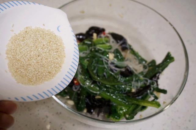 5、拌匀后倒入一小把熟芝麻,这凉拌菜吃起来更香浓。