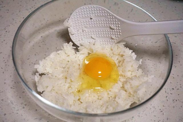 2、 剩米饭用饭勺碾开,倒入一个鸡蛋,搅拌均匀。