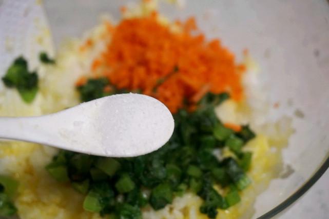 3、 倒入胡萝卜碎和莴苣叶,半小勺盐和少许白胡椒粉,拌匀。