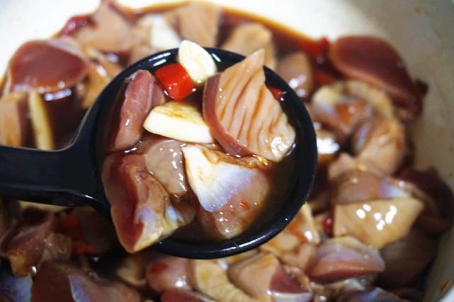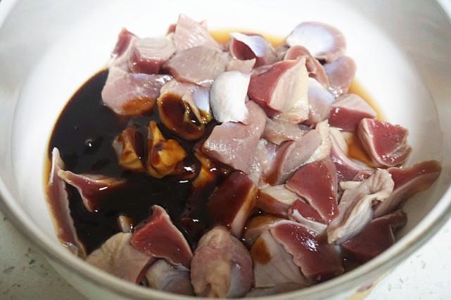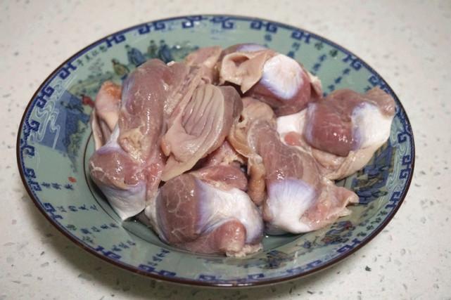 1、鸡胗要清理干净,把表面黄色部分要洗掉,切小块。