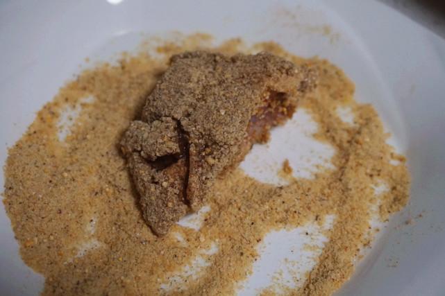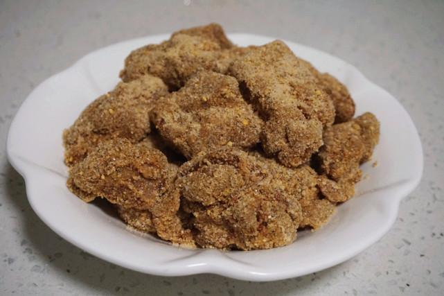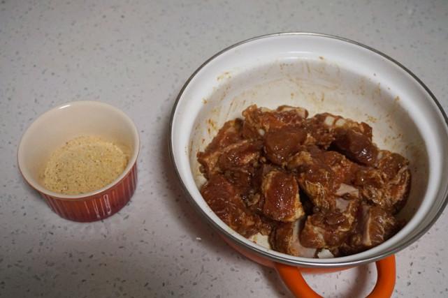 3、排骨裹入蒸肉粉,每块排骨都要均匀的粘到。
