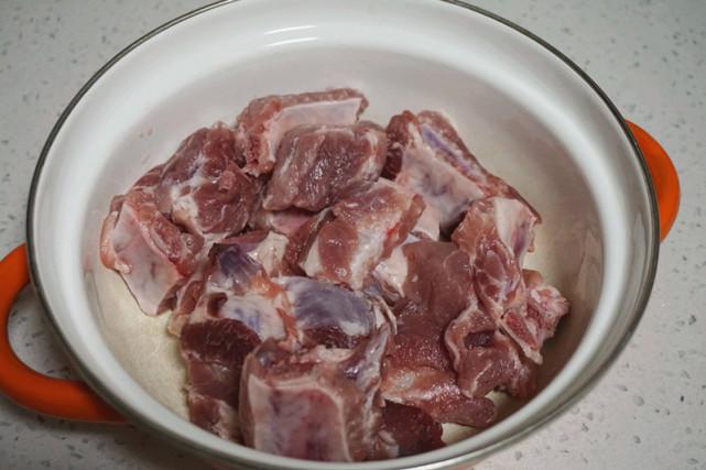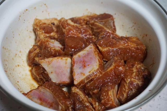 2、排骨沥干水分后,为了口感更入味更细腻,可以加入2大勺生抽、1勺料酒、少许五香粉、半小勺糖,用手抓匀。静置半小时。