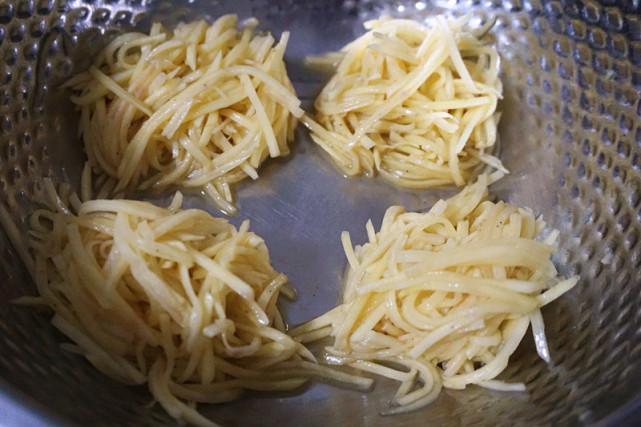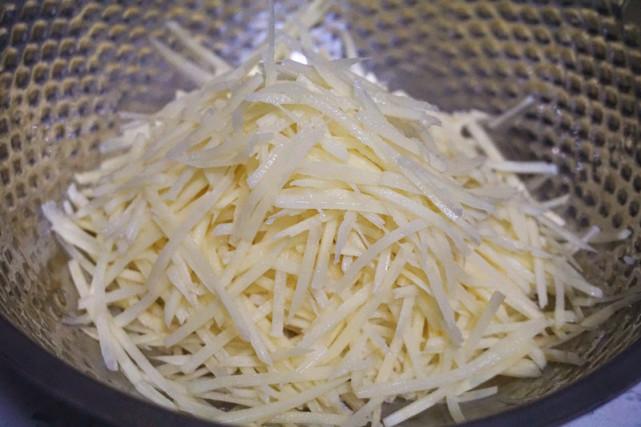 这里有两种做法,如果不加面粉的做法,土豆丝就不用过水,因为土豆本身含淀粉比较多,所以煎的时候不会散;如果加入面粉,土豆擦丝后过水沥干备用。
