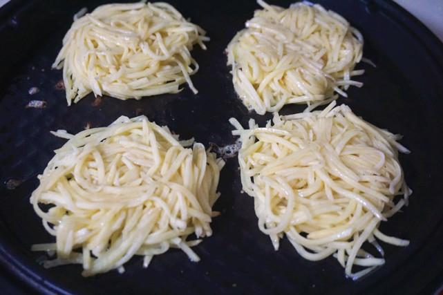 4、电饼铛刷上油,放入已经分成团的土豆丝,用锅铲压平。