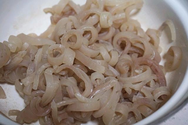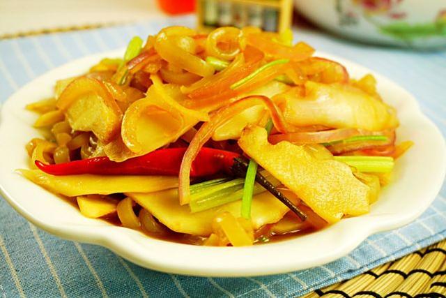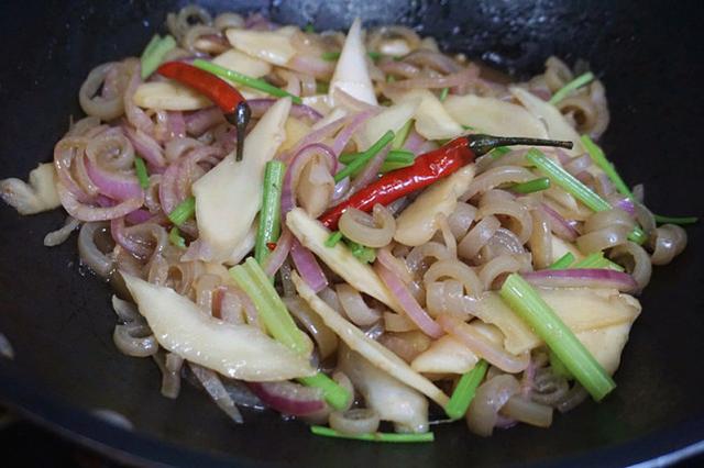 4、烹制猪皮的最重要窍门就是坐热油锅后,冷油就要放入肉皮翻炒,这样炒肉皮就不会炸锅。翻炒的时候,加入一大勺的料酒。