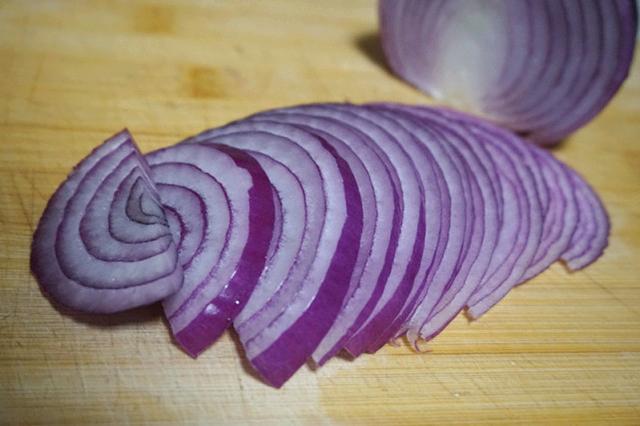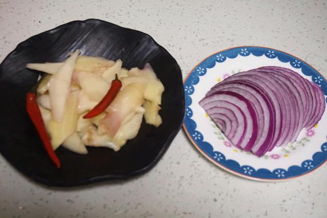 1、准备好需要的食材。放入紫皮洋葱,就可以不放葱姜这样的调味料,而且紫皮洋葱微甜,和猪皮很搭。