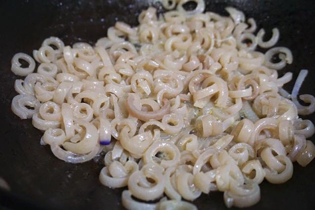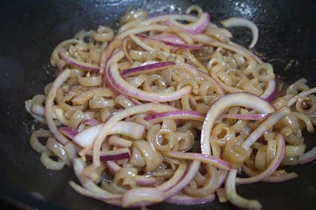 5、倒入洋葱,加入2勺生抽,爆炒中火翻炒,也是防止火大了肉皮炒糊,而且肉皮比较黏,也容易粘锅,所以勤翻炒。