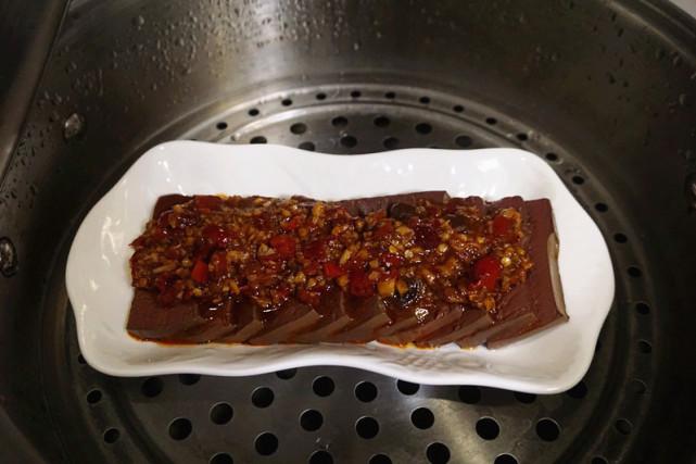 4、把炒好的酱料倒在鸭血上,上汽后大火蒸8分钟。