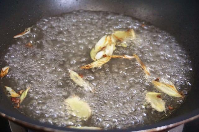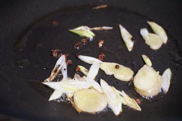 4、坐热炒锅,放入适量食用油,放入准备的5克花椒中的一半,炒出香味后放入葱丝姜片。