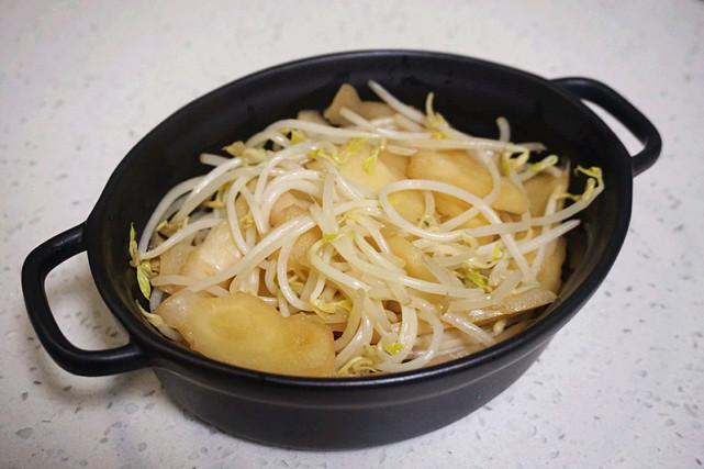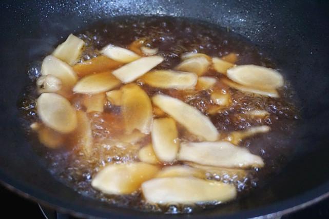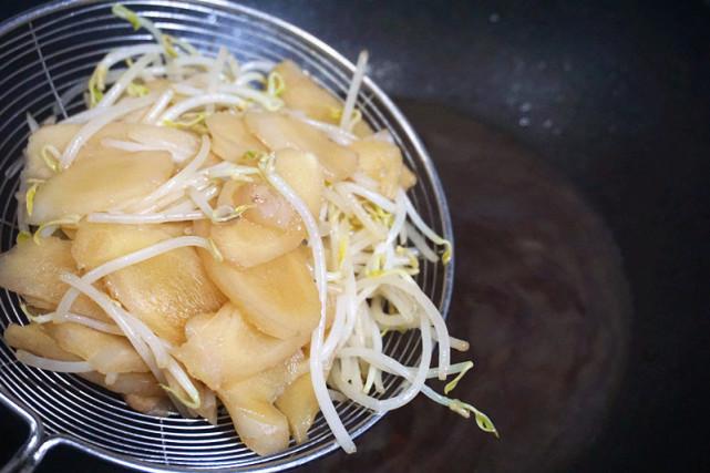 6、倒入酸姜片,加入2勺生抽、1勺料酒和适量糖,煮3分钟,接着放入绿豆芽煮沸。