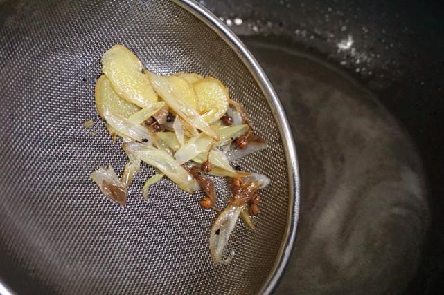 时间到了,把这些佐料捞出倒掉,只留下底汤。