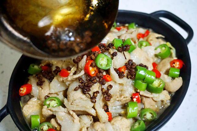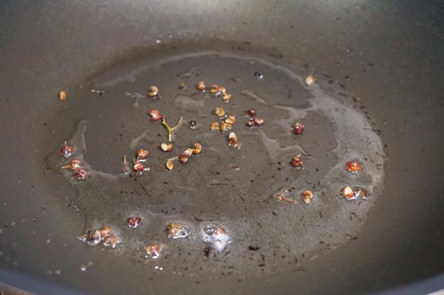8、最后一步,在炒勺上倒入适量食用油,加入刚才剩余一半的花椒,一起在灶台上加热到飘出椒香味,然后响油浇在菜品表面,滋滋的声音也伴随着浓郁的香味飘出,简直太香了。