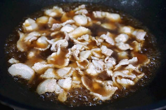 7、接着放入肉片,适量盐,煮2分钟,然后汤汁和肉片一起盛出。