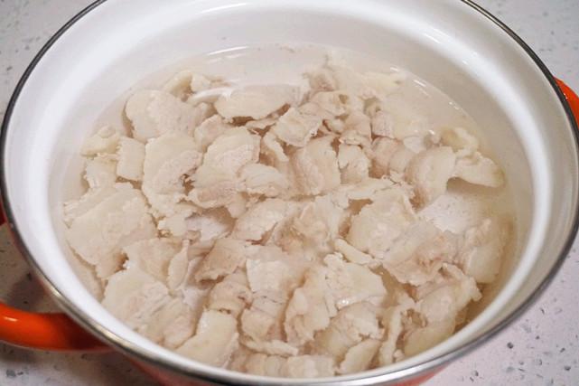 a、锅内放入冷水,下五花肉,煮到有浮沫就关火。这一步不要煮沸,因为煮沸的五花肉会卷起来,而且完全熟了,但一会儿还要对五花肉进行再加工,所以这步煮过了,五花肉就少了嫩滑的口感。