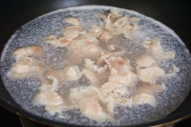 b、煮好的五花肉捞出过冷水,我是过了三遍水。头两次会有不少浮沫和油花浮在表面,所以要多过几遍水,这样不仅比较彻底的去除了油脂,还能使得肉片更劲道。