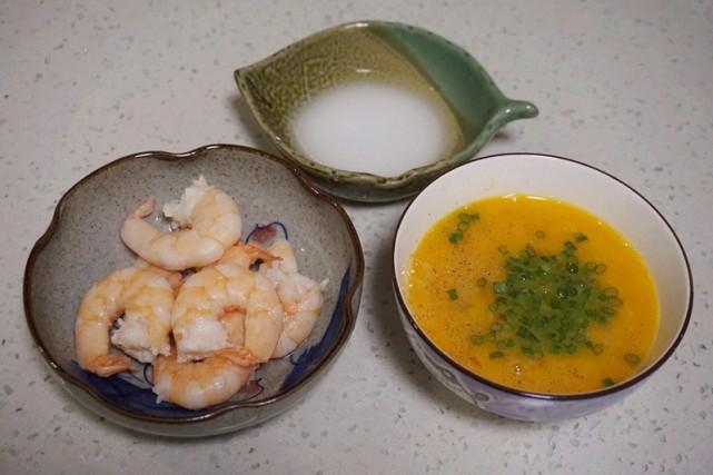 5、刚才腌制好的虾子放入沸水中焯半分钟,捞出备用。葱花放入蛋液中,两小勺淀粉加入适量清水,拌成水淀粉。