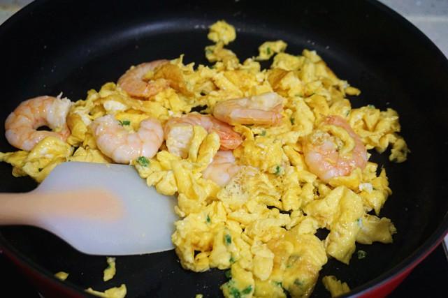 4、所有食材要一起混合后再放入炒锅里炒,这样可以保证虾仁和鸡蛋的细腻口感。