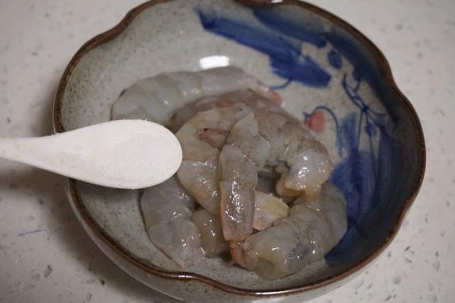2、青虾去壳去虾线后放入半小勺盐,抓匀,静置5分钟。这一步的目的是去掉虾子表面的粘液,经过此次处理虾仁才更清脆。之后用厨房用纸将虾表面的水分吸干,这样更容易包裹腌料。