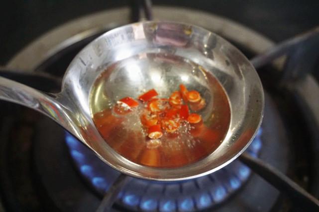 5、最后关键的一步就是做一小勺鲜辣的响油。小米椒和适量食用油一起放入灶台上加热,出现密集小气泡就关火。