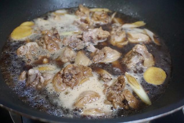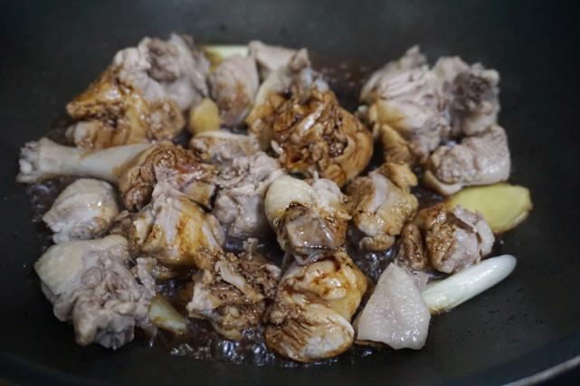 3、先爆香葱段姜片,然后放入鸭肉,加入2大勺生抽,炒匀。