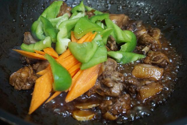 5、汤汁收到一半左右的时候,倒入备好的时蔬块。