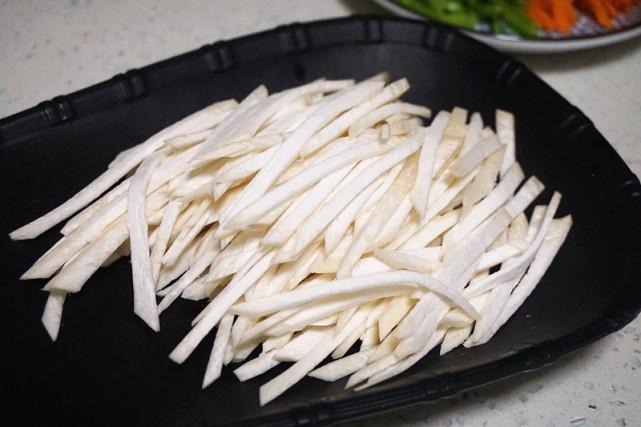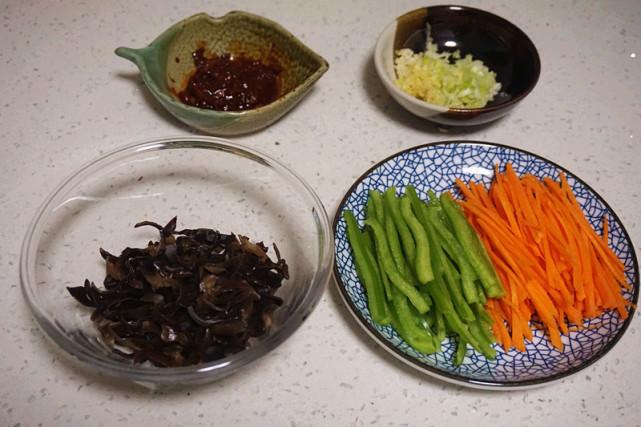 2、准备好其他的配菜和配料,木耳水发洗净后沸水焯半分钟再切细丝。