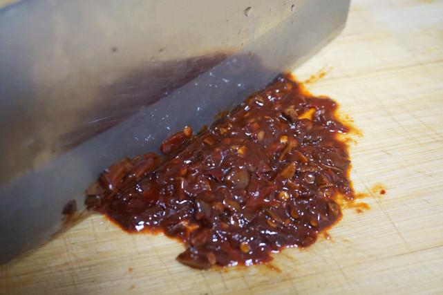 2大勺的郫县豆瓣酱,用刀切碎,这样爆香的时候,口感更细腻。