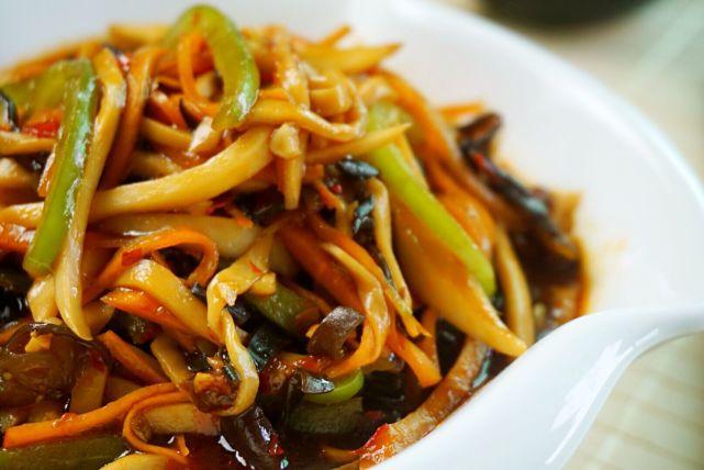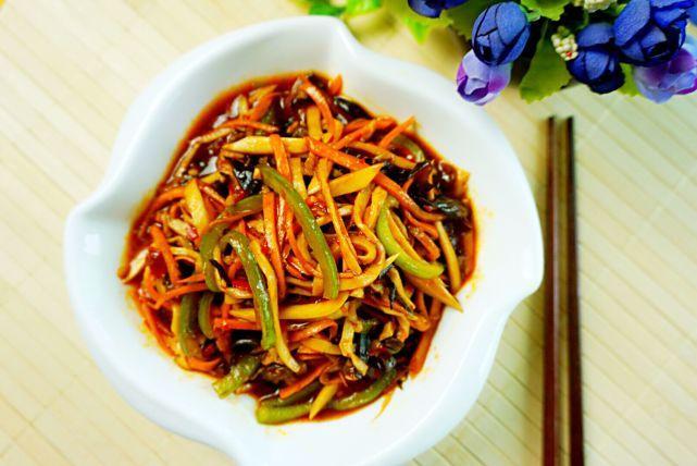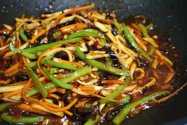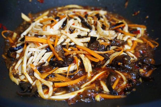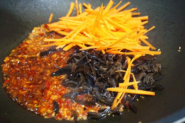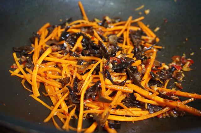 6、先放入胡萝卜丝和木耳丝翻炒1分钟。