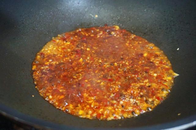 5、炒锅再次放入适量食用油,倒入葱末姜末蒜末炒香,再放入切碎的郫县豆瓣酱,加入1大勺料酒,炒匀。