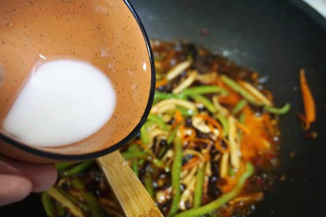 7、接着倒入鱼香汁,加入杏鲍菇,翻炒均匀后加入青椒丝,酌情倒入水淀粉,