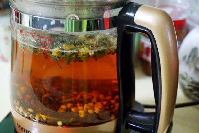 等温度达到90度,就可以放入玫瑰、桂花、茉莉花茶等,这时候材料就会在水里翻滚,达到一百度,再煮10分钟左右就可以喝了,把茶水设定在80度的保温状态,一上午的时间,随时喝都热乎乎的。