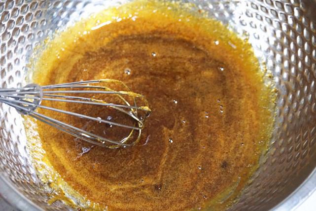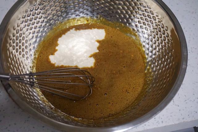 食用油和红糖蛋液混合,搅拌均匀,再加入豆奶,没有豆奶可以用等量的牛奶代替。