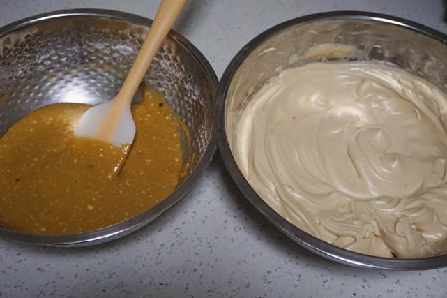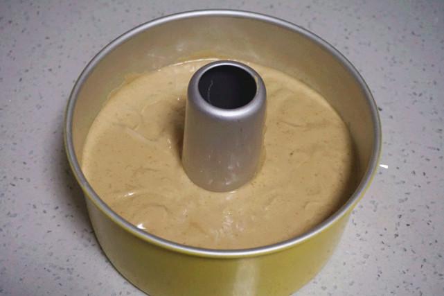 加入剩下的二分之一蛋白,再切拌均匀,最后倒入全部的蛋白霜进行充分切拌,倒入模具中,大力震荡均匀。