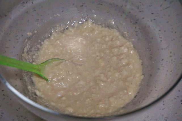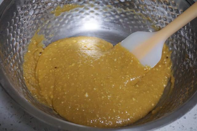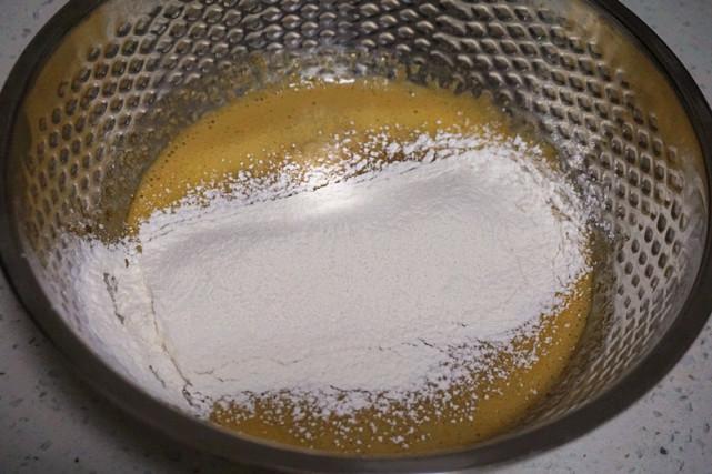 3、最后倒入碾好的豆腐,倒入食用油,再筛入低筋面粉。