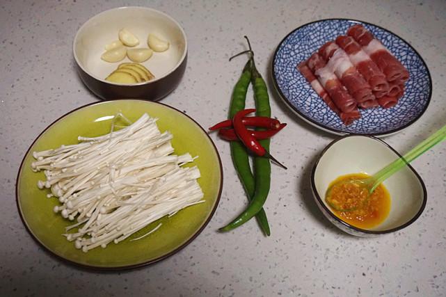 1、准备好需要的食材,肥牛要提前化冻,蒜切末,朝天椒和尖椒洗净切段,金针菇去掉梗,洗净过水焯20秒捞出备用。