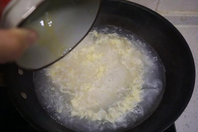 放蛋液的碗,在水再次煮沸后,保持一定高度,快速倒入,立即关火,这样蛋花细腻又润滑。