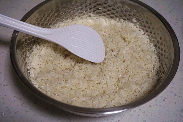 3、蒸好后用饭勺把糯米翻动打散,这样能使得糯米粉迅速降温,直到手触时感到温热。