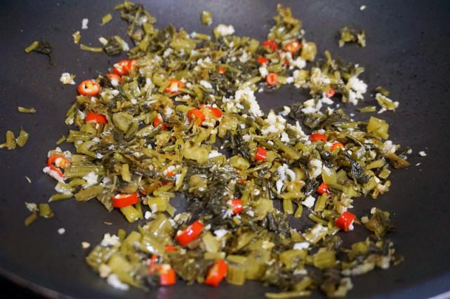 5、放入雪菜,翻炒均匀。