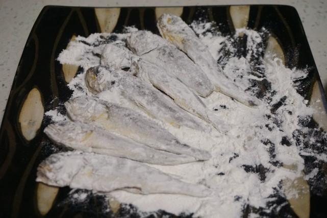 3、小黄鱼在面粉里滚一圈,均匀裹上面粉。